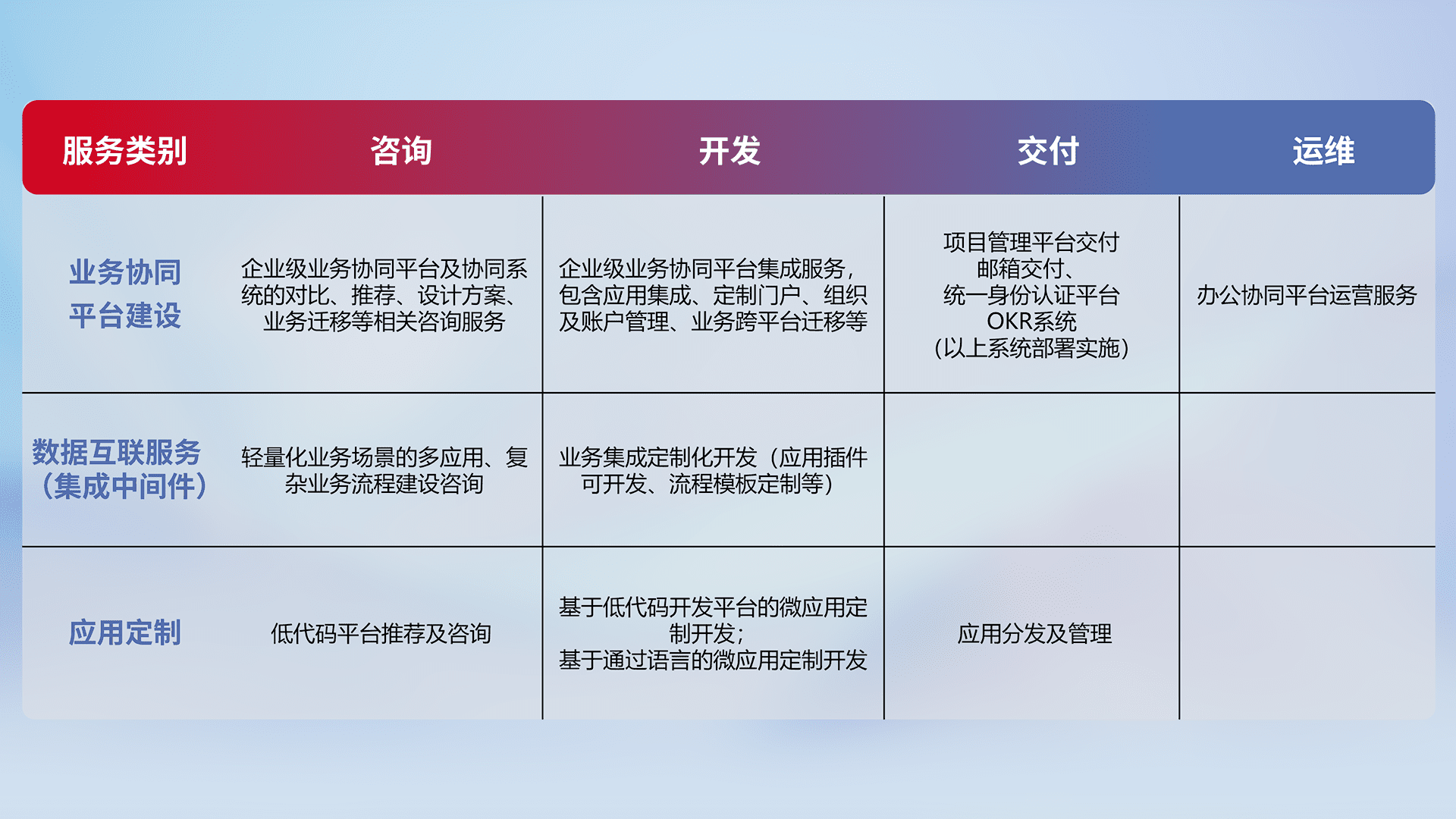 针对钉钉、、、企微、、IDaas等平台级产品提供产品的规划、、、方案、、、交付、、、定制化开发等服务,,实现如统一协同办公、、、智能客户服务、、、、混合会议管理、、、、智能数据查询、、等业务场景,,,,实现数字化转型。。。
